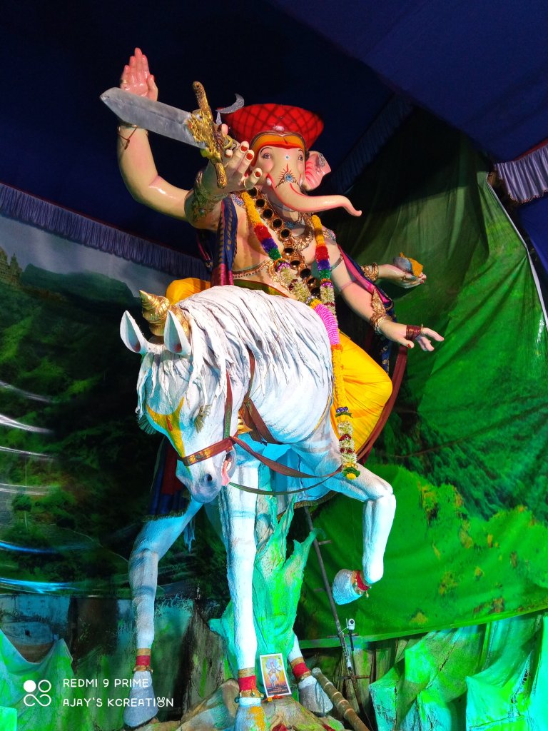 त्या बाप्पाचं (मंडळाचं) नावं होतं ‘कुलाब्याचा युवराज’. ह्या बाप्पाचा आगमन सोहळा सोशल मीडियावर बघितला होता. तेव्हा मल्हार मार्तंडच्या रुपातला हा बाप्पा मनांत खूप भरलेला. तेव्हापासूनच कुलाब्याचा युवराजची ओढ लागलेली. मी खूप वेळ जवळ जवळ 10-15 मिनिटे तरी बाप्पाला पाहत उभा राहिलो असेन.