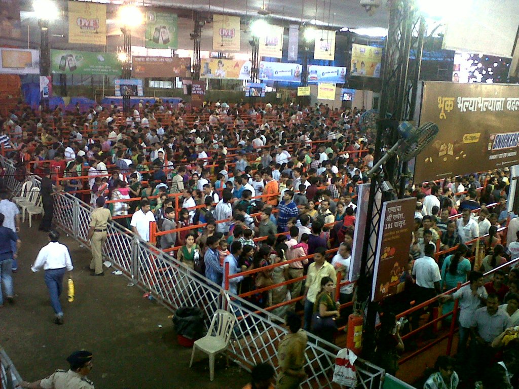 आता साडेचार वाजले. आता कुठे बाप्पाचं मुख दिसू लागलं. तिथेतर कल्पनेच्या बाहेरची गर्दी. त्यात आता भर म्हणून थेंब थेंब पाऊस पडायची सुरवात झाली. आता दोन पाऊलं चाललो की बापाच्या मंडपात पोचणार होतो. पण आता प्रत्येक पाऊल चालायला पाच मिनिटं जात होती. कस बस आता एकदाचं मंडपात पोचलो. आता कुठे अडीच तासाच्या प्रतीक्षे नंतर बाप्पाच्या दरबारात पोचलो.